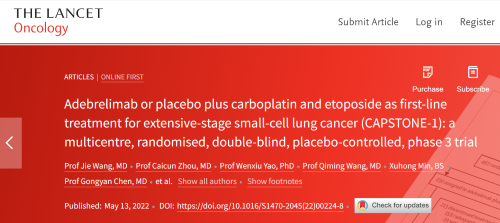 北京时间2022年5月14日,AG亚娱医药自主研发的PD-L1抑制剂阿得贝利单抗治疗广泛期小细胞肺癌的III期临床研究(CAPSTONE-1研究)成果正式全文在线发表于国际权威学术期刊《柳叶刀·肿瘤学》(《THE LANCET Oncology》,影响因子41.316)。CAPSTONE-1研究结果显示,阿得贝利单抗联合化疗一线治疗广泛期小细胞肺癌相较于安慰剂联合化疗可以显著延长患者总生存期至15.3个月[1],刷新现有免疫药物一线治疗广泛期小细胞肺癌的总生存纪录[2]