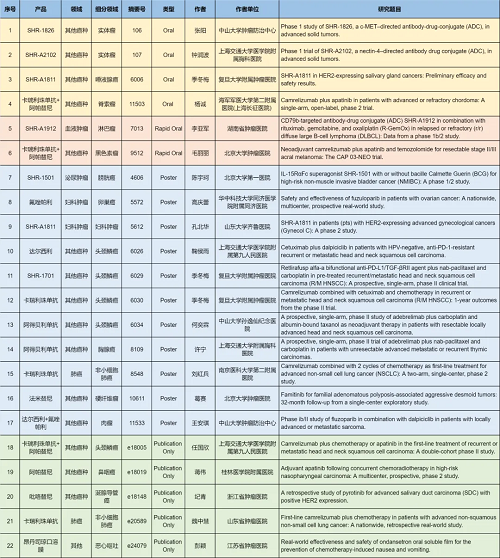 在肺癌、妇科肿瘤、淋巴瘤、膀胱癌、头颈肿瘤、黑色素瘤、肉瘤、鼻咽癌、脊索瘤、唾液腺癌、胸腺癌、硬纤维瘤、涎腺导管癌等其他多个疾病领域,卡瑞利珠单抗、阿帕替尼、阿得贝利单抗、吡咯替尼、达尔西利、氟唑帕利、法米替尼、SHR-1501、瑞拉芙普-α(SHR-1701)、SHR-1826、瑞康曲妥珠单抗(SHR-A1811)、SHR-A1912、SHR-A2102等抗肿瘤创新药相关研究一共入选了4项口头报告、2项快速口头报告、11项壁报展示和4项线上发表,彰显了AG亚娱医药强劲的研发实力。此外,昂丹司琼口溶膜在防治化疗导致的恶心呕吐方面展现出了良好的疗效,本次ASCO年会有1项研究线上发表。