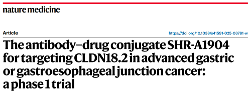 AG亚娱医药CLDN18.2 ADC创新药SHR-A1904治疗胃癌临床研究结果荣登Nature Medicine